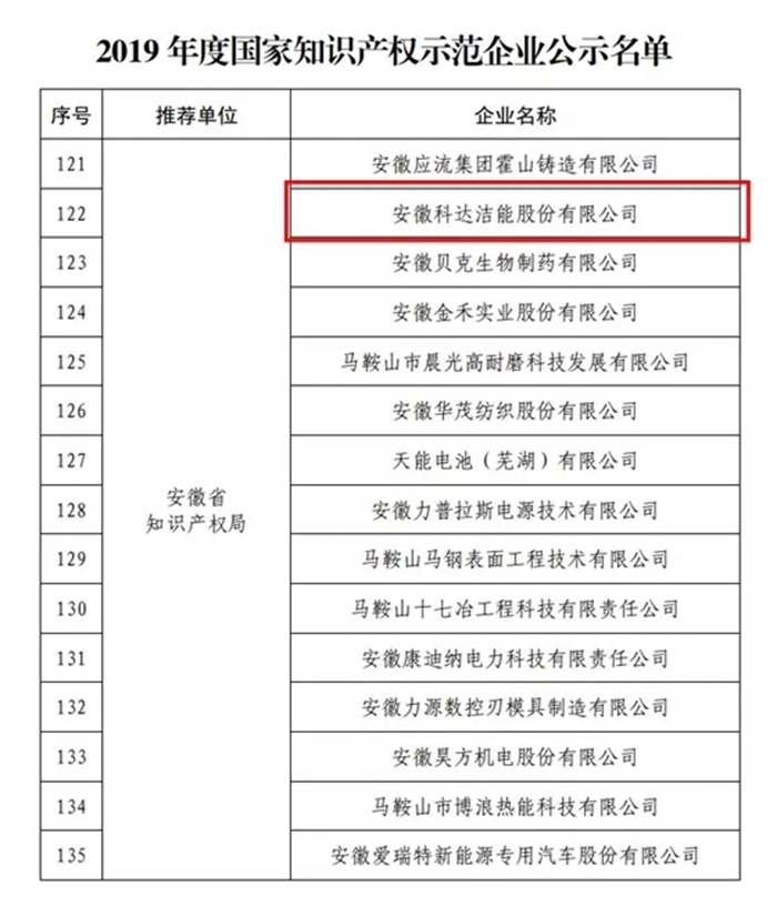 安徽科達潔能獲評2019年度國家知識產權示范企業
