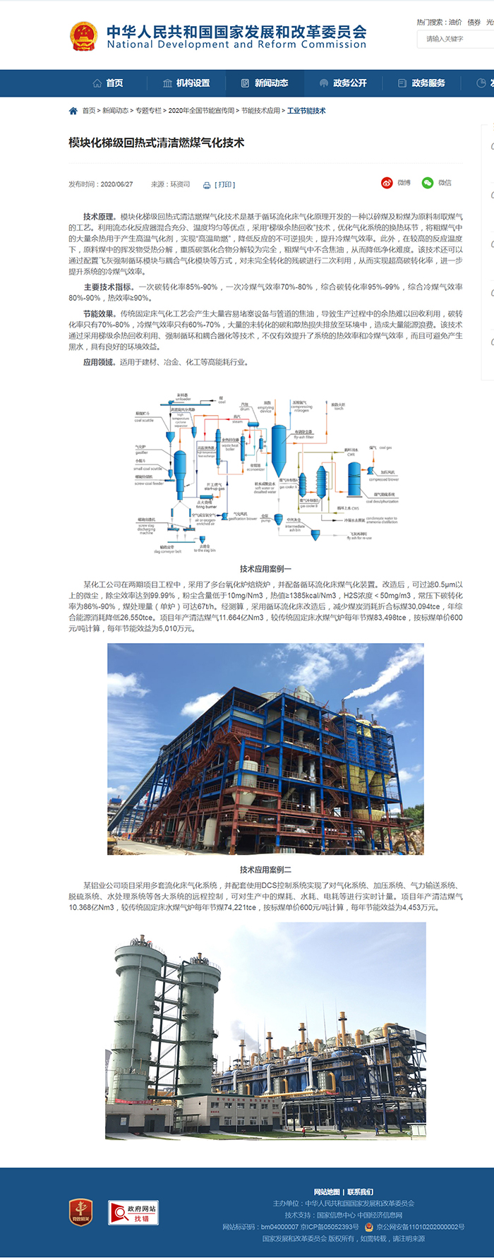 安徽科達潔能“模塊化梯級回熱式清潔燃煤氣化技術”作為節能宣傳周工業節能技術之一在國家發改委官方網站上進行了“云”上展示,分別從技術原理、技術指標、節能效果、應用領域等方面進行了全方位介紹。